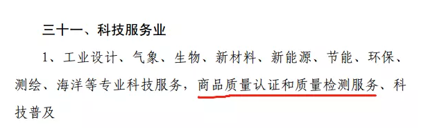 查阅《产业结构调整指导目录(2019年本,征求意见稿)》全文,质量认证和检验检测服务、标准化服务、计量测试等被列入鼓励类第三十一大类科技服务业第 一小类。截图如下: