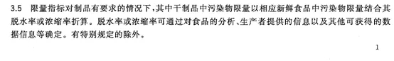 GB2762-2017《食品安全国家标准 食品中污染物限量》第3.5条规定:限量指标对制品有要求的情况下,其中干制品中污染物限量以相应新鲜食品中污染物限量结合脱水率或浓缩率折算。脱水率或浓缩率可通过对食品的分析、生产者提供的信息以及其他可获得的数据信息等确定。有特别规定的除外[1]。