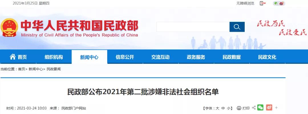 民政部公布2021年第二批涉嫌非法社会组织名单