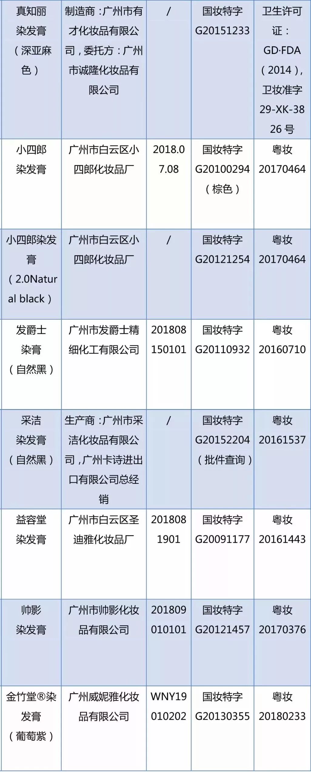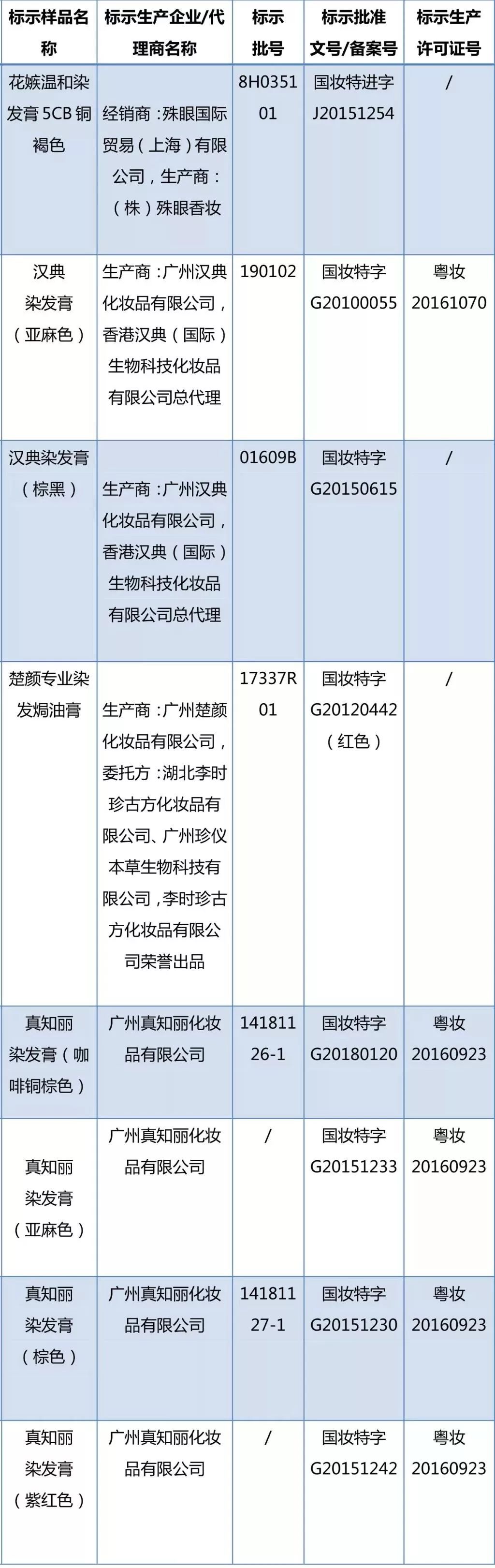 近日,国家药监局通报称,经四川省食品药品检验检测院等检验,标示为中山佳丽日用化妆品有限公司等企业生产的多款染发类化妆品检出成分与经批准的特殊用途化妆品配方成分不符;