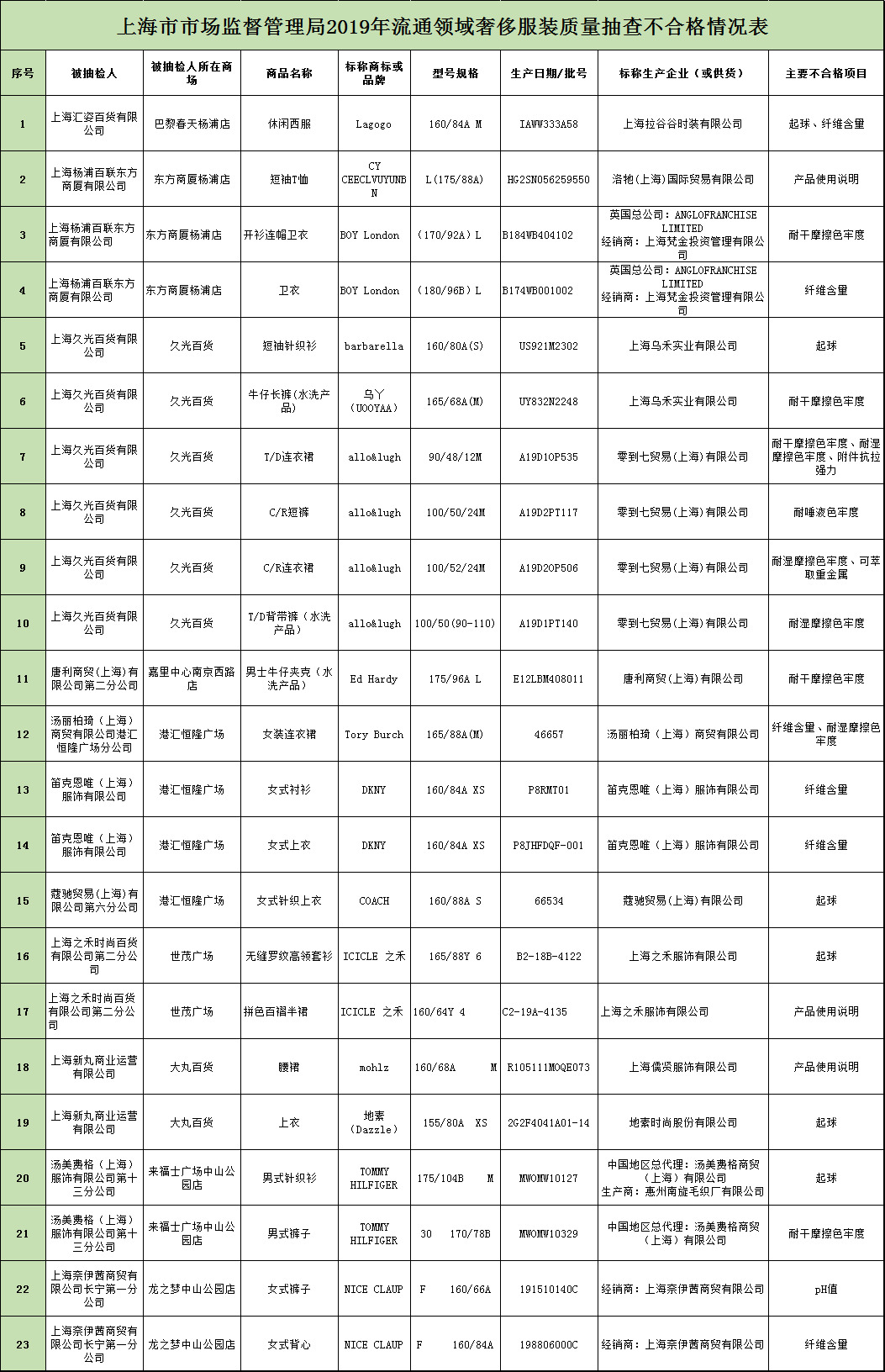 近期,上海市市场监管局对上海市流通领域销售的奢侈服装、丝绸服装、女式裙装进行了市场检查和质量抽检,共计抽检255批次,56批次不合格。其中,Coach、Tory Burch、DKNY、BOY London、Tommy Hilfiger等知名品牌在列。